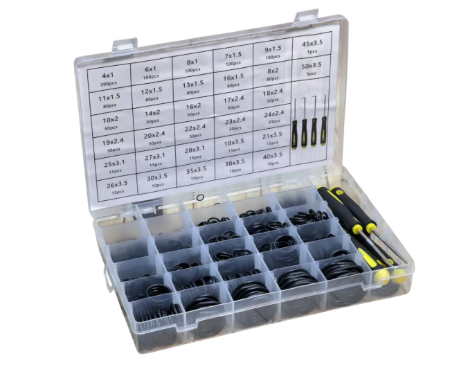 Универсальный комплект уплотнительных колец типа O-Ring (32 типоразмера) — незаменимый набор для ремонта гидравлических, пневматических и топливных систем. Все кольца изготовлены из высококачественного NBR-каучука, устойчивого к маслам, топливу, температурам и давлению. В комплект также входят 4 монтажных крючка для удобной замены уплотнителей в труднодоступных местах. Упаковано в пластиковый бокс с ячейками для удобного хранения.